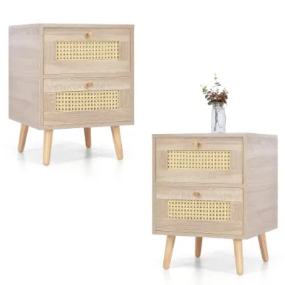 Nachttisch Beistelltisch mit 2 Schubladen Eiche Rattan Rattan Schubladenfronten Sofa Tisch Schlafzimmermöbel H55/w40/d40cm